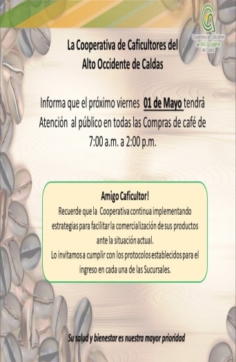 La Cooperativa de Caficultores del Alto Occidente de Caldas debido a la emergencia sanitaria por causa del COVID-19, ha implementado como estrategia la compra de café directamente en las Veredas, con la finalidad de brindar una solución eficiente a los caficultores que tiene dificultad para r...