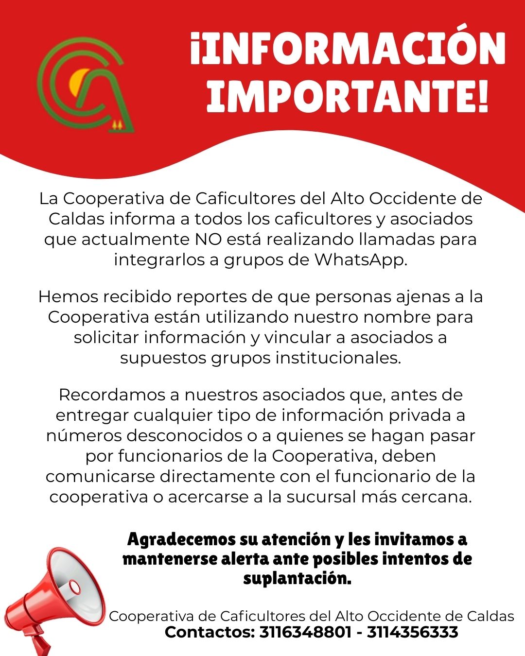 La Cooperativa de Caficultores del Alto Occidente de Caldas felicita y agradece a todos nuestros asociados por su valiosa participación en las reuniones informativas. Su compromiso, interés y disposición para aportar al fortalecimiento de nuestra organización son fundamentales para seguir constr...