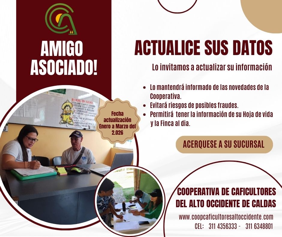 La Cooperativa de Caficultores del Alto Occidente de Caldas felicita y agradece a todos nuestros asociados por su valiosa participación en las reuniones informativas. Su compromiso, interés y disposición para aportar al fortalecimiento de nuestra organización son fundamentales para seguir constr...